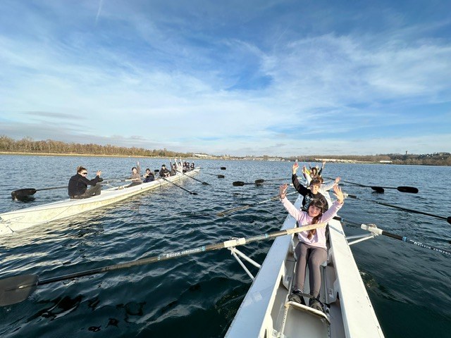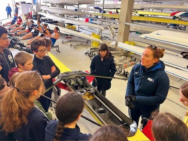 Hélène Lefebvre, médaillée olympique et membre du club de l’Encou aviron, nous a présenté l’ensemble du site et les élèves ont eu la chance de ramer sur des bateaux de huit sur le bassin olympique.