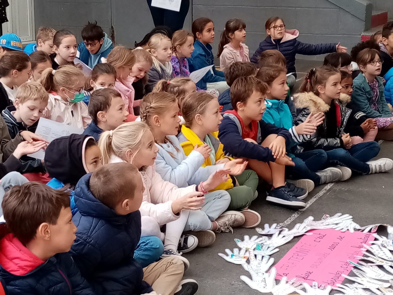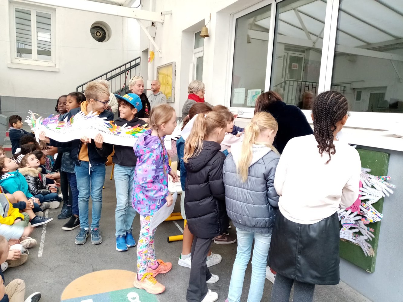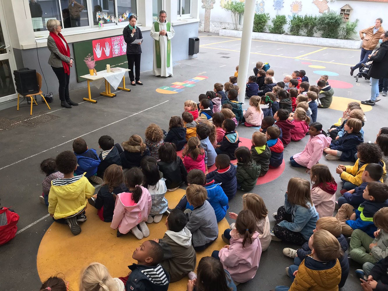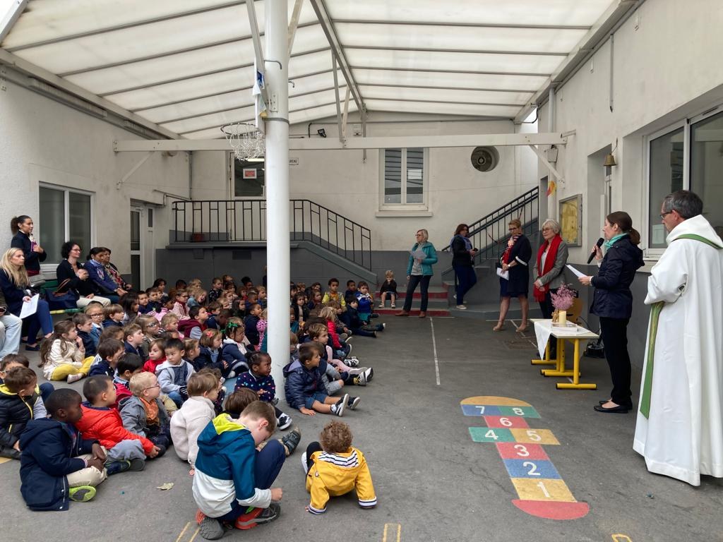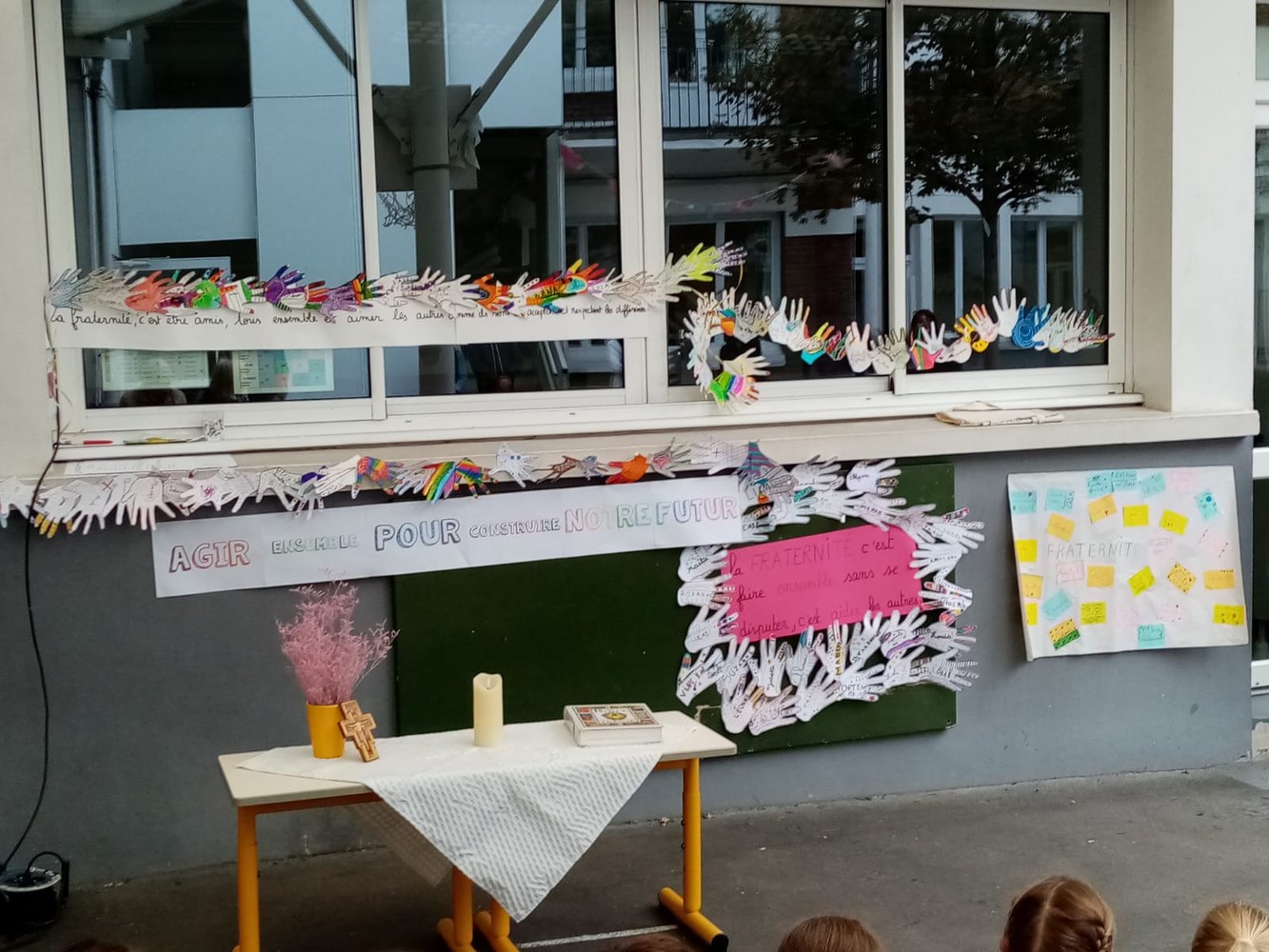 Les enfants, les directrices, les enseignantes, les parents et le Père Gilles se sont réunis dans la cour de l'école pour ce moment de partage, placé cette année sous le signe de la Fraternité.