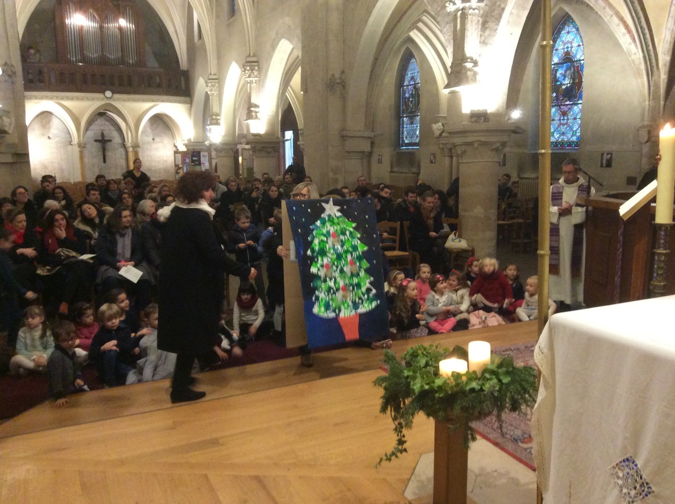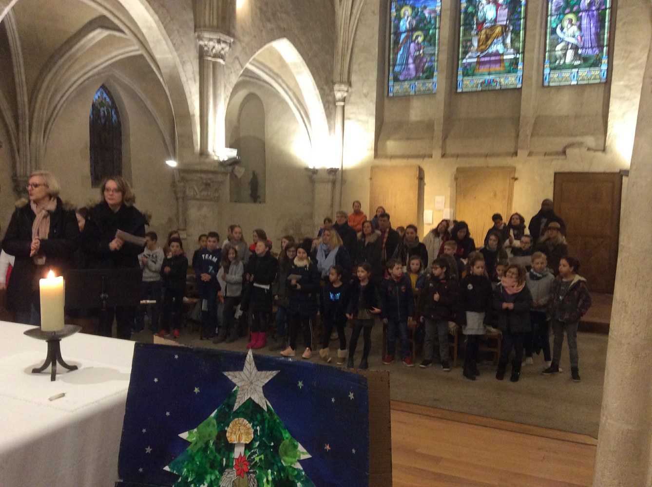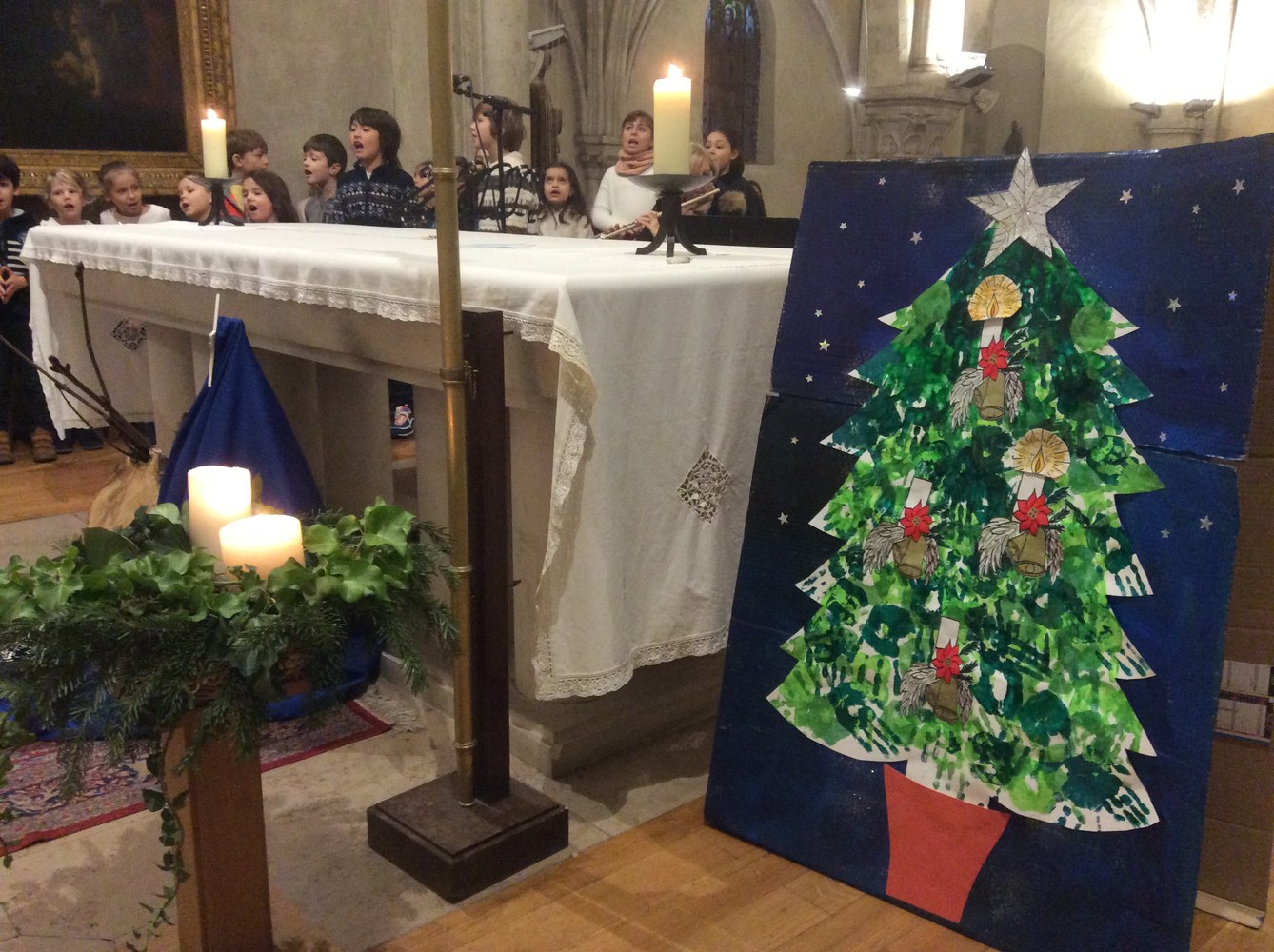 Les enfants de maternelle ont apporté un sapin réalisé dans les classes qui a été décoré de flammes et de bougies, symboles de lumière, par les élèves de CP et CE1.